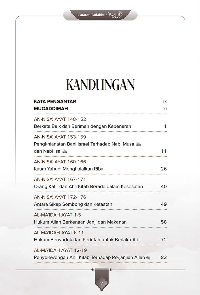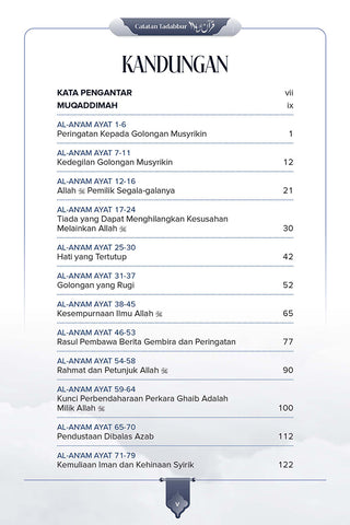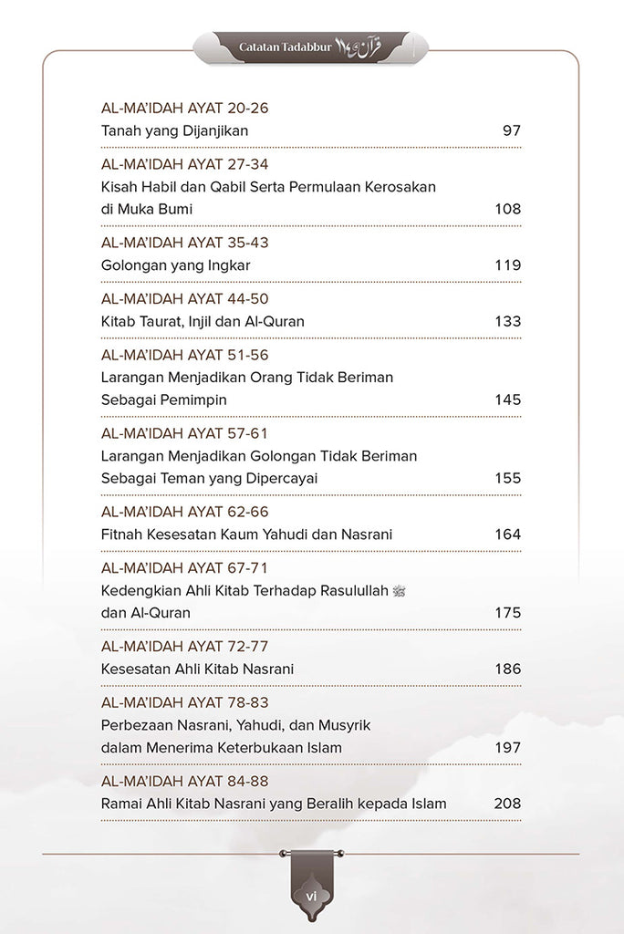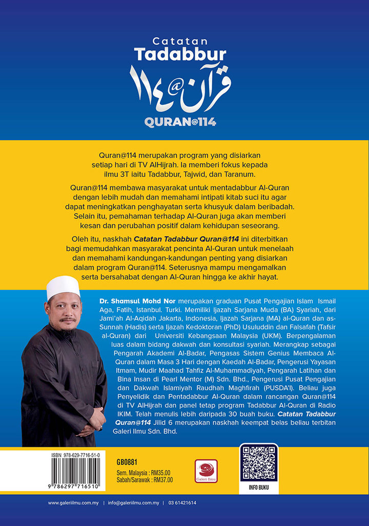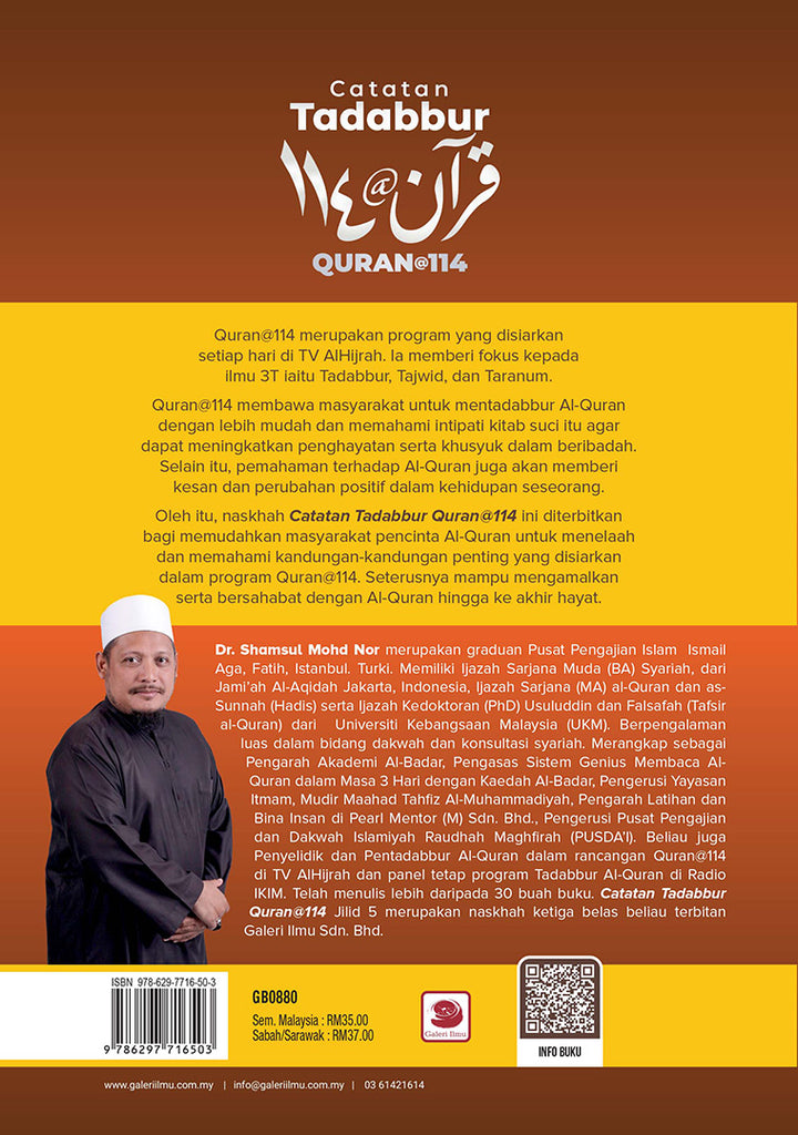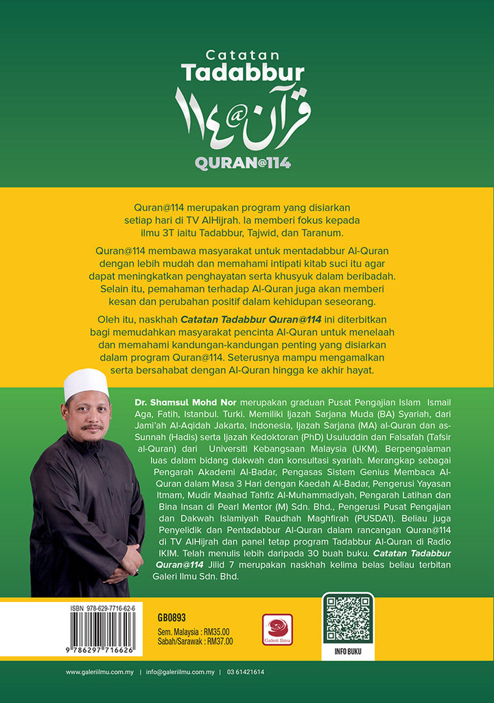 Oleh itu, naskhah Catatan Tadabbur Quran@114 ini diterbitkan bagi memudahkan masyarakat pencinta Al-Quran untuk menelaah dan memahami kandungan-kandungan penting yang disiarkan dalam program Quran @114. Seterusnya mampu mengamalkan serta bersahabat dengan Al-Quran hingga ke akhir hayat.